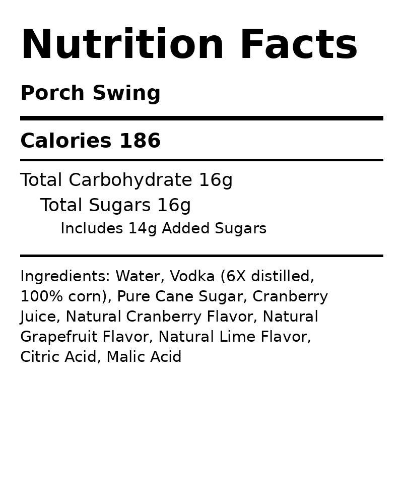 Enjoy this one taking in a sunset at the end of a GoodDay. The Porch Swing is our take on the Classic Sea Breeze cocktail. With the fruit-forward flavors of cranberry and grapefruit, don't be surprised if you start day dreaming about being at the beach!